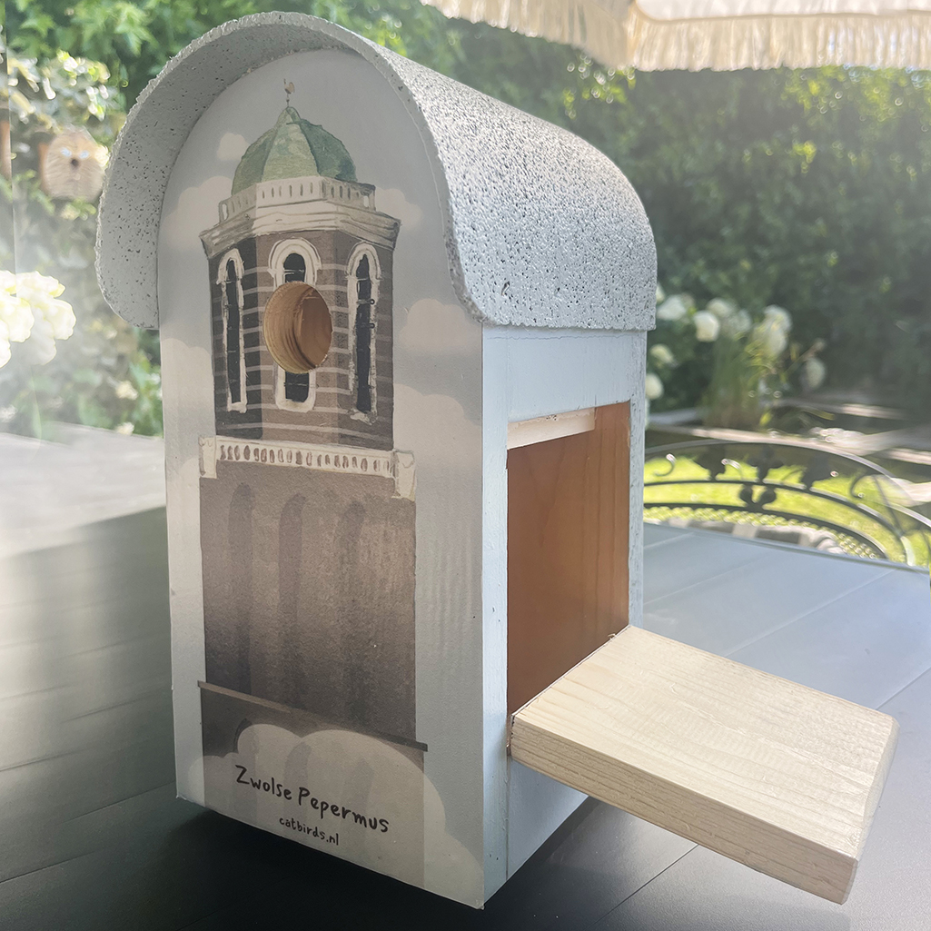 Op zoek naar een bijzonder vogelhuisje dat écht iets zegt over Zwolle? Dit unieke ontwerp van Catbirds toont een sfeervolle illustratie van de Peperbus, hét herkenningspunt van de stad. De invliegopening zit precies op de plek waar bij de echte toren de klok hangt – alsof de musjes zelf de tijd bewaken!